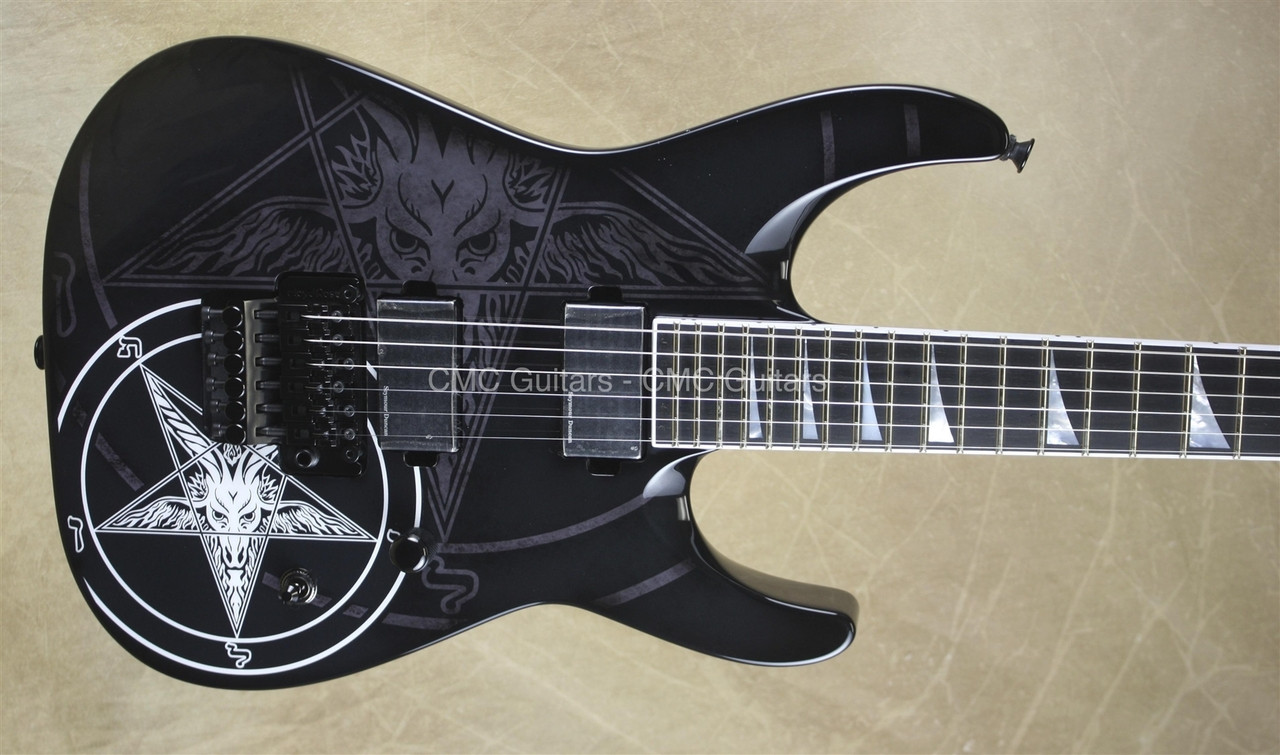 Unique Features: Jackson® Baphoment Graphic on Body, Seymour Duncan Blackout Pickups, Custom Shop Decal, White Bound Fingerboard and Headstock.